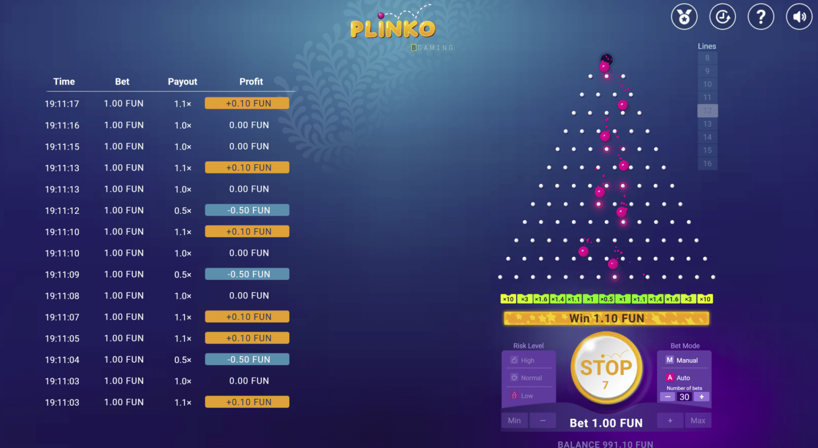 Ja, Spieler können im Plinko Casino echtes Geld gewinnen. Ihre Jackpots hängen von Ihrem Einsatz, Ihrem Risikolevel und der Position der Runde auf dem Spielfeld ab.